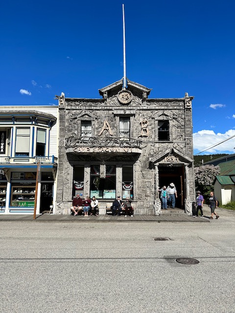 On Sunday we went to Skagway with Jamie, Vance, Dacotah & Seeley. Jamie and Vance got a new boat, so we just went for a ride. It takes about 45 minutes to get there. We walked around and shopped. I got an Native Alaskan mask to go with the caribou hide-I think it looks great on the wall in our living room! We also had a soft serve ice cream cone (something you can’t get in Haines) which was delicious. We went to a local Brewery for lunch and I had a rhubarberita-YUM! Then we boated back home. It was probably the prettiest/warmest day we’ve had so far and it almost felt like we were on a MN lake except much bigger with snow covered mountains on either side. We returned home to get ready for the work week