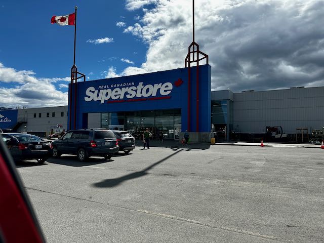 On to Canadian Tire, Canada’s answer to Menard’s. We loaded up on some items that were needed and then on to Real Canadian Superstore, which is a huge grocery store. I’m not gonna lie, it was pretty tough to resist all of the beautiful fruits and veggies that we aren’t allowed to bring back, but we managed to stock up on a few staples that are so much cheaper with the exchange rate. We ran into the couple from Anchorage (it’s a small world after all playing in the background) and had a nice chat with them. When we first tried to get a cart, we realized it was one of those where you had to put $ in to unlock them like Aldi. We didn’t have any Canadian change (you needed a dollar that is one coin) and a kind young lady told us that the head of key would work also, so we proceeded to take keys off the key chain and try to shove them in the slot with no luck. The lady was waiting for us to come through with a cart and when we didn’t, she came back around the corner and gave us a Canadian $1 dollar coin! We couldn’t catch her to pay her back with a US dollar. The couple from Anchorage said they had the exact same experience, and a nice person gave them a dollar. Canadians are nice but don’t like to work on Sundays-LOL! We decided to exchange names and phone #’s and keep in touch.