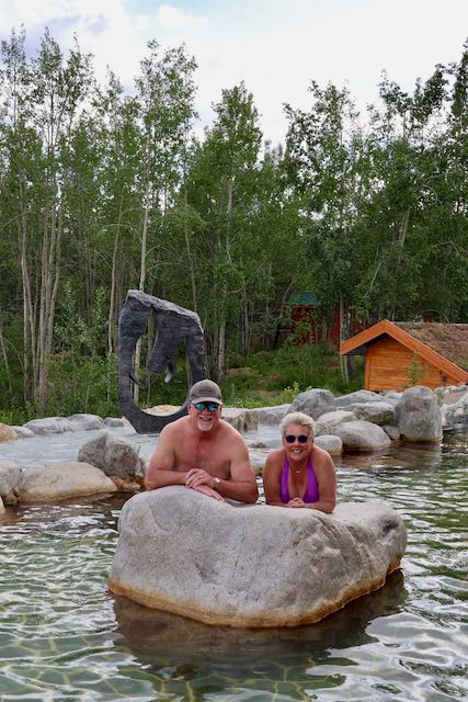 We got to the Nordic Spa and Hot Springs at 2:30 pm and it was beautiful!!! They had hot tubs, four different pools all with beautiful rock work surrounding them. They had an “illumination room”, “hibernation room” (which had zero gravity recliners), saunas, steam rooms, showers etc. You are supposed to first relax, then go sit in the Hot Springs, then take a cold shower and rest again until your body gets back to temperature and do it all over again. I told Steve that I hadn’t been that relaxed since February-LOL! They had a little café, and we got a little cheese plate and a glass of wine to sit and have on the deck overlooking the springs-HIGHLY RECOMMEND! We met a nice couple from Anchorage while there. We went back to the hotel, changed, and went downstairs to the Indian restaurant that is attached to it. When we walked in, we saw Alexa, our dental assistant, and her husband Chase. She introduced us and we asked if they wanted to join us for dinner. We had a great time. The food was excellent. They are in their early thirties and have traveled all over the world. They were also rafting guides in Montana for several seasons, and we got to hear some great adventures.